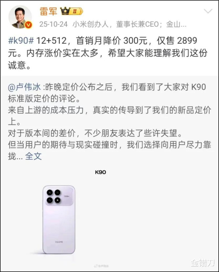 旧年红米K90发布后,雷军就曾无奈地浮现过加价的势头和原因。