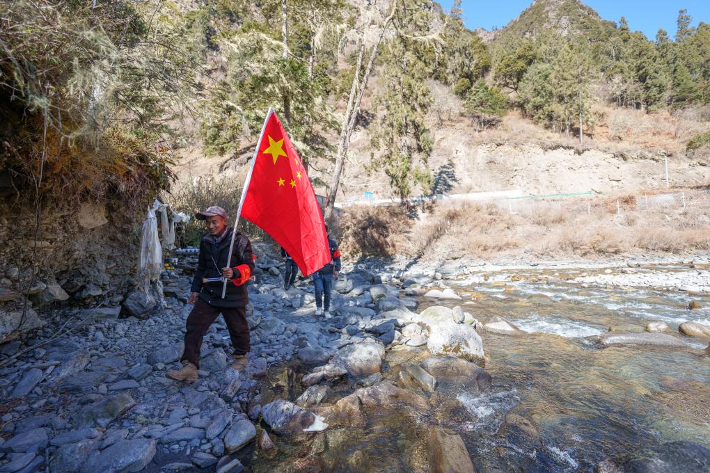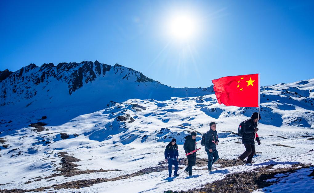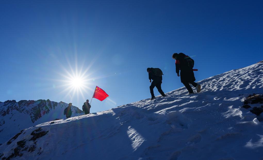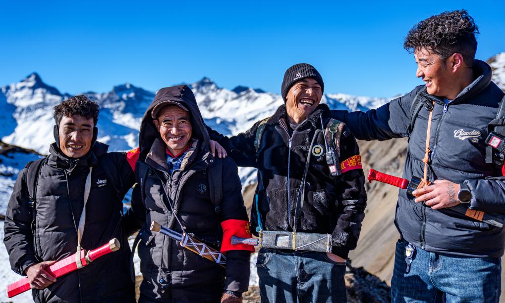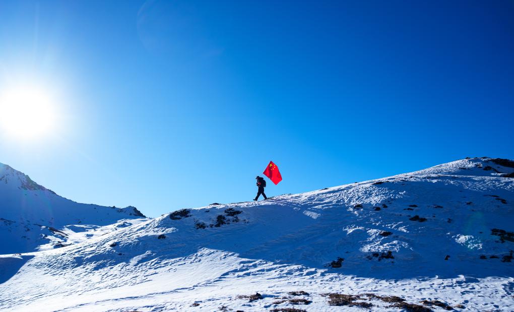 冬日时节,西藏山南市隆子县玉麦乡的群山遮蔽着积雪。4名护边员曙光中行进在雪山间,50岁的普布罗布肩扛国旗,走在队伍最前边,索朗多吉、拉巴次仁、洛桑罗布紧跟后来。