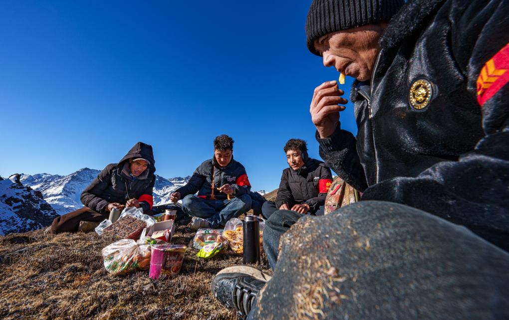 2月6日,在西藏山南市隆子县玉麦乡境内,护边员们在捕快途中吃午饭。他们围坐在一派平坦草地,从背包里掏出糌粑、卡塞(一种传统油炸面食),再喝几口酥油茶,这等于捕快护边途中一顿简便的午餐。